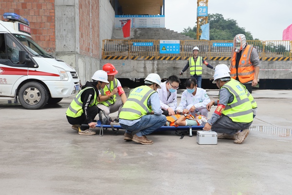 “立即啟動火災事故應急預案,撥打報警電話,通知各救援小組立即趕赴現場!”隨著項目經理秦自力的一聲令下,工地各應急救援小組及時趕到“事故現場”,拉起警戒線,有序疏散人員并對傷員展開緊急救援。隨后,醫療人員與消防官兵也及時趕到了現場,對傷員進行治療,迅速撲滅火源。