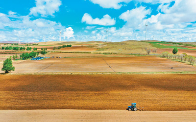 時下正值內蒙古自治區春播高峰期,農作物播種面積已超過1億畝,苗情長勢良好。內蒙古各地積極落實生產者補貼、耕地輪作制度試點等惠農政策,進一步調動農民種糧積極性,努力擴大糧食播種面積。連日來,烏蘭察布市商都縣農民搶抓農時,在塞上高原開展春耕春種。圖為5月26日商都縣西井子鎮的農民駕駛農用機械在田間翻地。