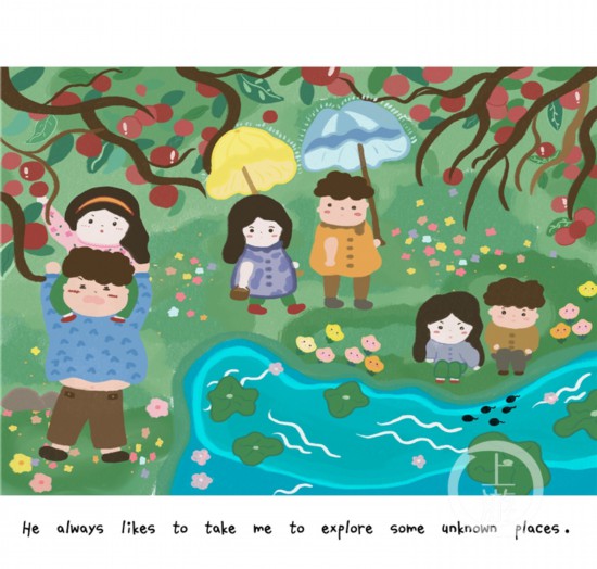 為完成這件作品,她采訪了外婆、媽媽和弟弟的同學,分別了解他們童年的記憶!暗艿艿幕卮鹗亲钕矚g和同學玩ipad游戲。我很喜歡媽媽那個年代的童年,他們在山中盡情玩耍,下河摸魚,上樹采果,跳橡皮筋……很幸運我的童年也很快樂,因為是‘放養式’的!辨合残Φ。
