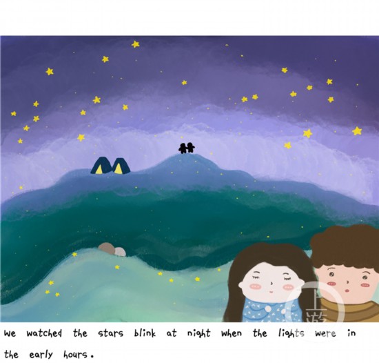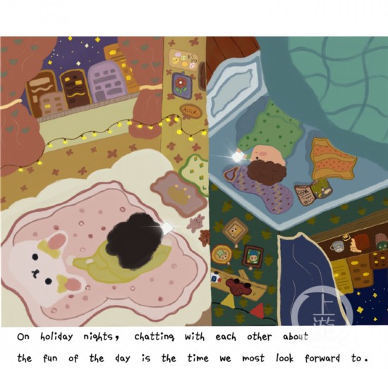 她學習畫畫其實僅一年多,但賦予了情感和感悟的畫作,卻充滿了靈動。在高三申請藝術院校時,需要交作品集。她創作了三件作品,其中一件就花了三個月時間,將自己和男朋友的故事畫成插畫,色彩斑瀾,富有童趣。 “很多學生談戀愛都是躲躲藏藏,連男女生單獨說個話,老師都會干涉!彼J為,校園戀情其實大都純真又簡單,家長和老師們不必過于擔心,她希望用畫筆描述這樣真摯又美好的情感。