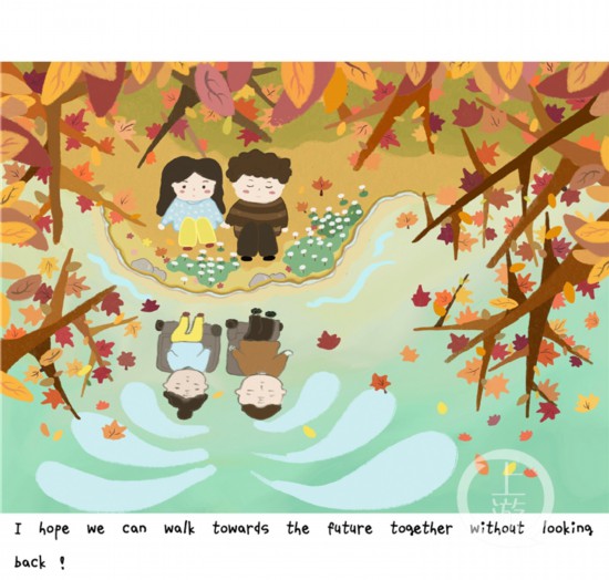 在插畫中,她畫出和男孩安靜地坐在一起,水里的倒影是兩人老了以后的樣子!八倳谖液ε禄螂y過時保護我!薄霸诩倨诘耐砩,打電話彼此聊著這一天的趣事,是我們最期待的!痹诶铈合驳墓P下,這份純潔的戀愛,像一條點綴著彩虹的小路,甜美又帶有憧憬地輕輕鋪開。