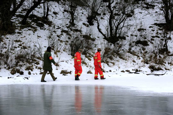 大雪后的陰條嶺,氣溫零下20多度,黃澤飛(右一)和隊友在巡山途中。謝志強攝(照片拍攝于2021年1月)