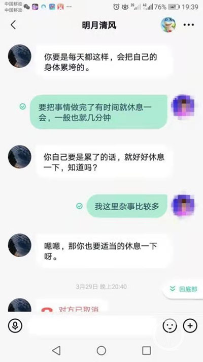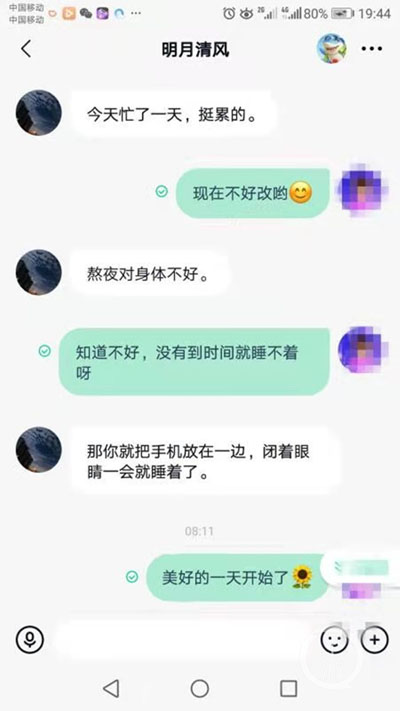 隨后的兩天時間里,張正國表現得非常貼心,據葉女士回憶:“早上他會問候上班累不累,中午會問候吃飯沒,晚上會問候下班沒,深夜還會提醒我睡覺。而且只要我發出信息,基本上都是很快會回復,幾乎成了全天24小時的陪聊好友!