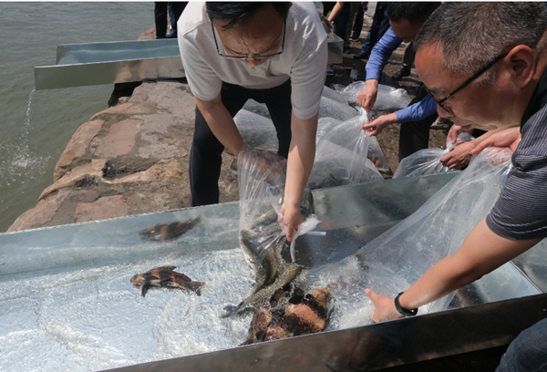 工作人員將珍稀特有魚緩緩放入滑槽中。周小平攝