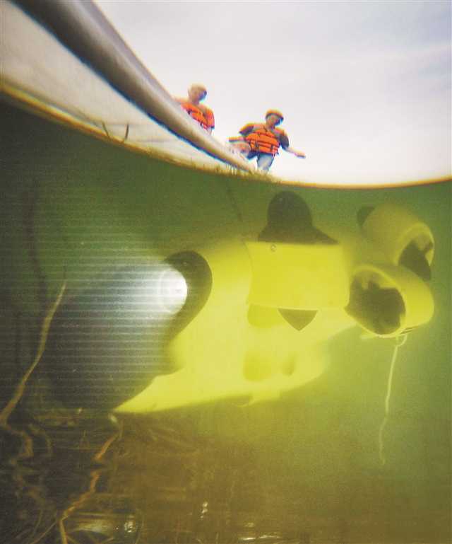 科研人員操控水下無人機,查看魚在水草上的產卵情況。