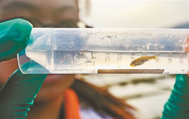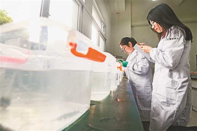 西南大學水產學院漁業資源與保護學實驗室,科研人員查看魚苗生長情況。