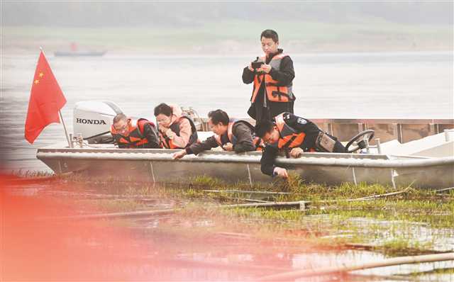 “看,這根水草上有好多魚卵……再往前靠一點,我拍幾張照片回去存檔!5月29日,長江上游珍稀特有魚類國家級自然保護區江津段古家沱魚類產卵場,西南大學水產學院科研隊員們劃著小船,老師張春霖在船上操控著水下無人機,觀察魚在水草上的產卵情況。