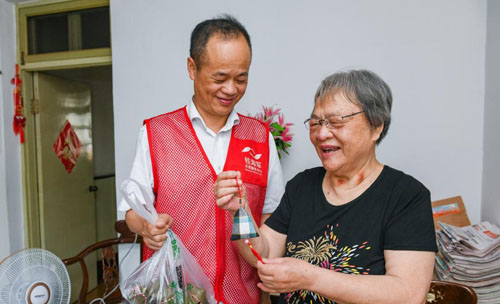 6月9日,志愿者給結對的81歲的朱春芬老人(右)送上端午節的玉米、粽子和香囊,共迎端午。