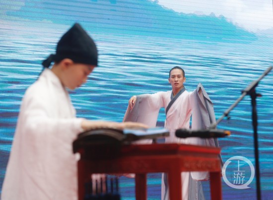 上游新聞記者現場看到,當天上午,沙區的非遺傳承人和文化志愿者齊聚三峽廣場,非物質文化遺產展演活動內容多元,精彩連連。甫一開場,熱鬧歡騰的鼓舞《獅舞祥瑞》就吸引了觀眾的視線,隨后,金錢板、川劇變臉、古琴演奏、四川清音等接連上演,觀眾目不暇接,濃郁的文化韻味令人回味無窮。牡丹獎得主、曲藝名家凌淋也以重慶市級非遺諧劇節目《一分不能少》壓軸亮相。最后,戲曲舞蹈《梨園春》為演出劃上句號。