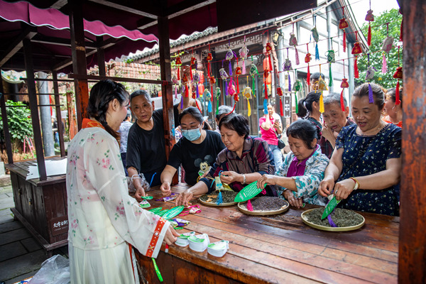在古街活動現場,桃片、泥塑、根雕、剪紙等非物質文化遺產現場一一制作展示,讓市民群眾近距離感受合川非遺傳統手工制作之美,領會非遺文化的獨特魅力。在端午民俗體驗活動中,包“愛心粽”、打糍粑、沐蘭湯、掛香包、五彩繩、畫額、現場書畫、旱地龍舟、投壺、放紙鳶和畫彩蛋等邀市民游客們一起參與制作、體驗,感受傳統佳節的熱鬧氣氛。在會江樓前百姓茶館處,新時代文明實踐文藝志愿者們為觀眾帶來吟詩、朗誦、古代禮儀展示、傳統樂器演奏等各類演出,內容多彩、形式多樣,彰顯了傳統文化古韻悠長。