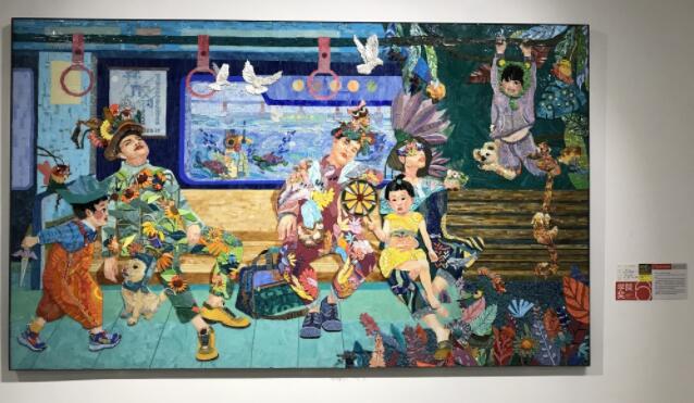 走進展廳,2017級壁畫專業的韓汶羽采用浪漫主義手法帶來的壁畫《十七點的車廂》,就徹底放飛了想象。其中的大人、小孩都衣著鮮艷不說,車廂里看似不可思議地出現了猴子等小動物!皠游锸呛⒆拥南胂!表n汶羽面對鏡頭講述了自己創作的幕后故事,“累了一天睡著了的大人,做的夢是向陽而生,所以他衣服上全都是大朵大朵的向日葵……”
