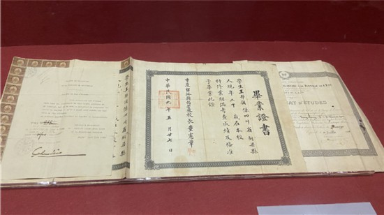 1920年5月20日,重慶留法預備學校校長童憲章發給王邦倜的畢業證書,以及四川省公署1919年8月11日發給他的合川縣中學畢業證書。