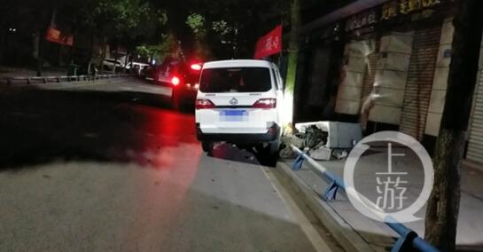 在現場,一輛白色面包車停在路邊,車身受損較重,路邊配電箱被撞倒。所幸駕駛員系了安全帶且車速不快,事故并未造成人員傷亡。