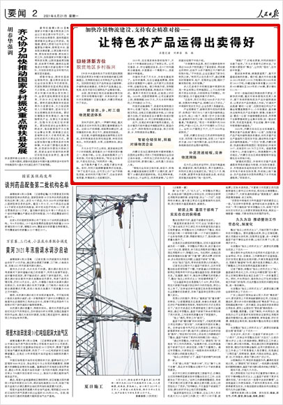《中共中央國務院關于實現鞏固拓展脫貧攻堅成果同鄉村振興有效銜接的意見》明確提出,支持脫貧地區鄉村特色產業發展壯大。加快脫貧地區農產品和食品倉儲保鮮、冷鏈物流設施建設,支持農產品流通企業、電商、批發市場與區域特色產業精準對接。