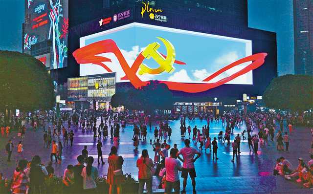 6月20日晚,江北區觀音橋商圈,“亞洲之光”戶外巨幕上播放出慶祝建黨100周年的裸眼3D畫面,吸引不少市民拍照。