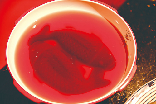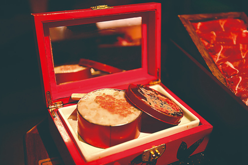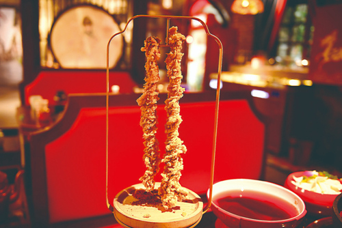 她意外地發現,這家火鍋店的菜品十分有意思:血旺被做成了兩條水中嬉戲的魚、麻辣牛肉平鋪在一口舊旅行箱里、蝦滑則是緊緊壓在摩登女“胭脂盒”里。最奇特的是酥肉,被廚師做成了幾十厘米的長酥,掛在架子上,淋漓盡致展示著重慶人的豪爽大氣,食用時食客可用剪刀吃多少剪多少……