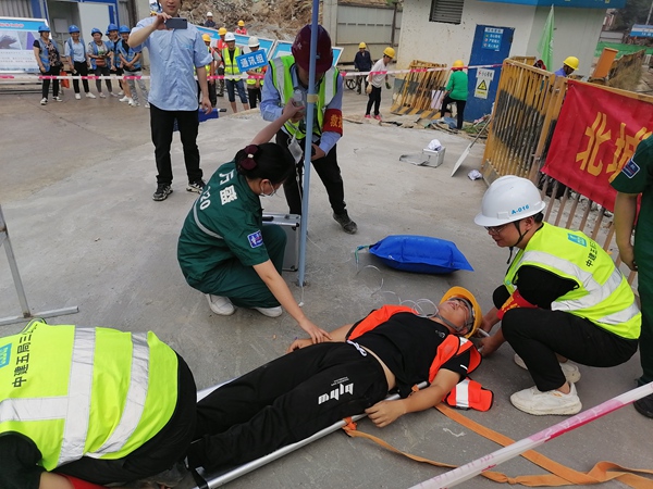 據介紹,此次演練綜合分析了當前安全形勢,分為“腳手架坍塌事故應急演練”與“中暑應急演練”兩部分。施工現場管理人員發現出現安全事故后立即向上級部門報告,第一時間啟動應急預案,聯同萬盛應急管理局專業救援隊及萬盛區人民醫院急救中心進行應急響應,警戒、救治、處置等動作連貫,一氣呵成。兩場演練精心策劃、周密安排,各應急小組反應迅速、配合高效、操作規范,使得整場演練達到了預期效果,有效檢驗了應急預案的安全性和可操作性。
