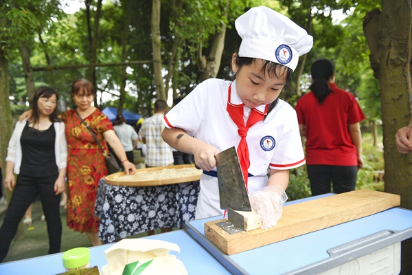在一旁的民俗園中,孩子們在老師的帶領下,搭起涼棚,開展石磨豆花、包粽子、打糍粑、手切桃片等傳統民俗勞動,用荷田里的荷花等原材料研制飲料、小吃等系列產品!跋仁浅疵,然后磨粉……最后是切片和包裝!眮碜院洗ò褪裥W四年級的學生劉智宸,一邊向圍觀的叔叔阿姨們介紹制作合川桃片的流程,一邊操作著切刀,動作嫻熟地切著桃片。