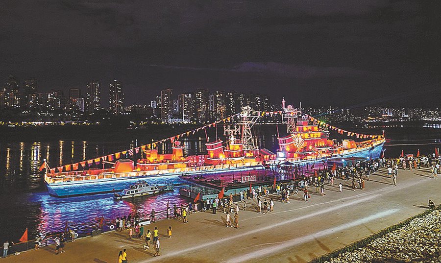 六月三十日晚,九龍坡建設碼頭,166艦燈光秀吸引了許多市民駐足欣賞。當晚,166艦“慶祝建黨百年主題燈光秀”正式開啟。記者 鄭宇 攝\視覺重慶