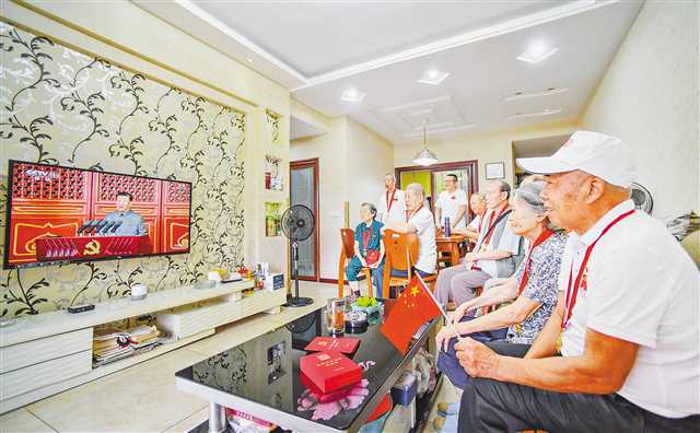 7月1日,綦江區古南街道綦齒社區,黨齡50年以上的老黨員們聚在一起收看慶祝中國共產黨成立100周年大會盛況。特約攝影 陳星宇/視覺重慶