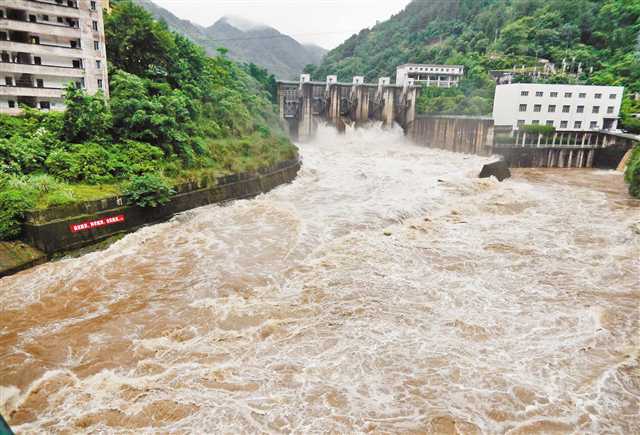 7月7日,渝東北強降雨持續。受降雨影響,位于渝東北的開州東河、云陽湯溪河和奉節甲高河、朱衣河、車壩河等多條中小河流出現漲水。圖為云陽縣外郎鄉遭遇暴雨后,位于磨刀溪中下游的門檻灘電站開閘泄洪。通訊員 陳建華 攝/視覺重慶