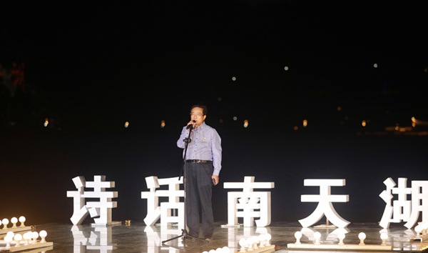 夜色降臨,波光粼粼的湖面,夢幻迷離的炫彩燈光,映襯著“詩話南天湖”幾個大字,給這場活動烘托了文化浪漫的氣氛。