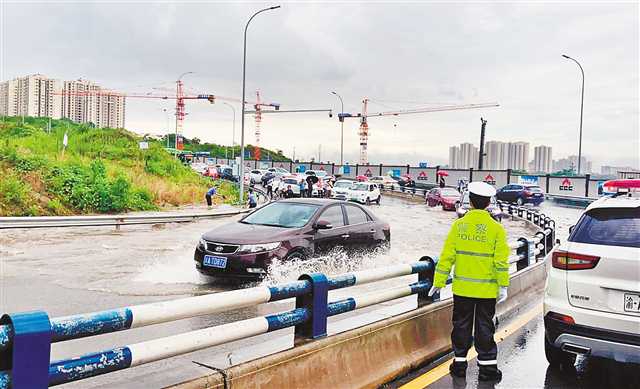7月12日,江北區魯家山攪拌站因暴雨導致路面積水,交巡警提醒過往駕駛員聽從指揮,小心慢行。市公安局供圖