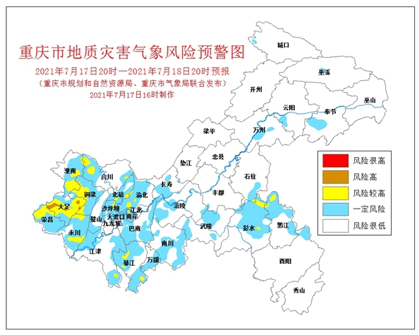 人民網重慶7月17日電 7月17日16時,重慶市規劃和自然資源局、重慶市氣象局聯合發布全市地質災害氣象風險預警。