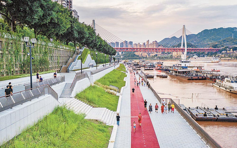 7月19日,渝中區東水門-儲奇門段濱江步道,市民正在休閑健身、欣賞江岸城市美景。該步道長約1.4公里,近日完工并開放,屬于“兩江四岸”治理提升工程珊瑚公園片區的一部分。通過消落區沿線生態打造、環境綜合治理、配套設施更新等改造,濱江步道岸線煥然一新,成為中心城區“美麗山水”風貌特色的重要景觀展示帶。