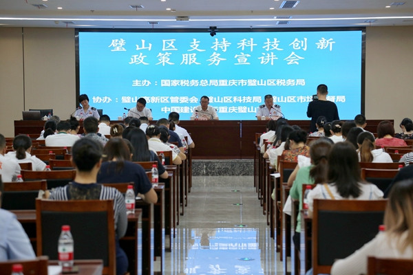 區稅務局、區科技局、區市場監管局、中國建設銀行重慶璧山支行等單位的負責人為140名企業代表講政策、送服務。李豪 攝