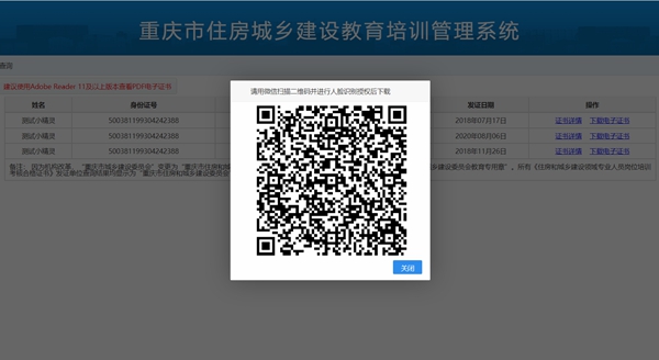 持證人員需登錄“重慶市住房城鄉建設教育培訓管理系統”(http://jsgl.zfcxjw.cq.gov.cn:8005/cqjsgwjypx/login)點擊證書查詢,輸入姓名和身份證進入個人證書查詢界面,點擊下載電子證書,此時系統會彈出二維碼,持證人用手機掃碼進行人臉識別,識別成功后,持證人即可在系統界面下載電子證書。若連續3次識別不成功,系統將提示識別失敗,本人與照片不符,持證人員可申請修改相關信息。