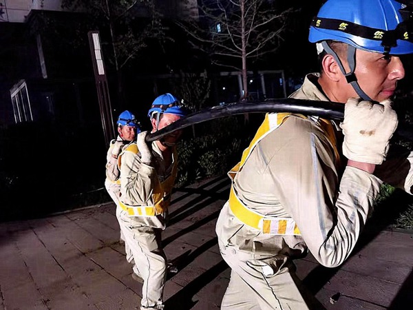 兩個多小時前,趙吉業和15名“戰友”接到了指揮部的命令,緊急支援明德園小區搶修,負責1臺箱式變壓器調試、5棟樓260米線電纜的施放及試驗等工作。