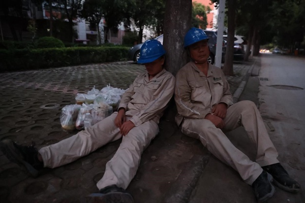 鄭州學府花園小區送電后,國網重慶電力援豫抗洪救災紅巖共產黨員服務隊隊員在搶修現場席地而坐,短暫休息。龔超攝