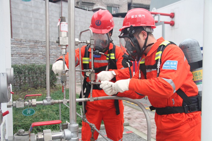 黎偉(左)在加氣站搶險維修。重慶燃氣集團供圖