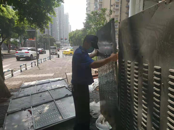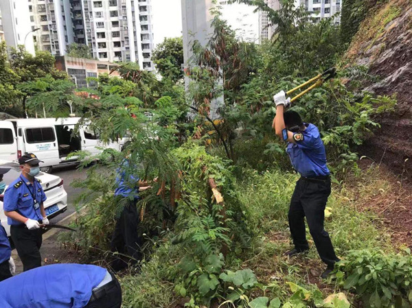 城管隊員在洋河花園社區清理倒塌圍欄。觀音橋街道供圖