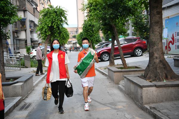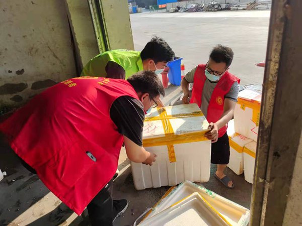8月5日,在40度的高溫天氣下,志愿者們在各個檢測點來往奔波送冰塊,一箱冰塊大約50斤重,當天大家運送了1噸多冰塊,雙手磨得通紅,衣服濕透了又干,皮膚也被曬黑了幾度。