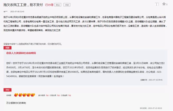“萬分感激你們的幫助!7月21日,網友徐先生在人民網“領導留言板”上為辦理單位點贊。他在今年2月和3月在重慶市忠縣烏楊鎮天地藥業中電四項目部上班,從事機電設備的安裝和焊接工作。在此期間,總承包商和分包商一直沒發工資,至今拖欠他近兩萬元工資,多次討要未果。7月8日,徐先生在人民網“領導留言板”留言求助。收到留言后,忠縣人力資源和社會保障局勞動監察支隊多次與分包、總包企業溝通協調。一周后的7月15日,徐先生被拖欠的工資19080元全部結清。