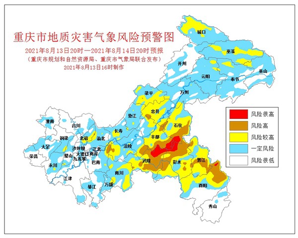 8月13日20時至8月14日20時,豐都縣、石柱縣、彭水縣、武隆區、酉陽縣屬于風險很高地區,地質災害氣象風險等級為一級(紅色預警),涪陵區、忠縣、梁平區、黔江區、巴南區、北碚區屬于高風險地區,地質災害氣象風險等級為二級(橙色預警),云陽縣、巫溪縣、奉節縣、巫山縣、長壽區、墊江縣、南川區、城口縣、萬州區、萬盛經開區、渝北區、永川區、璧山區、銅梁區屬于風險較高地區,地質災害氣象風險等級為三級(黃色預警),江津區、綦江區、江北區、南岸區、秀山縣、開州區、榮昌區、潼南區、合川區、大足區、渝中區、兩江新區、沙坪壩區、大渡口區、九龍坡區屬于一定風險地區,地質災害氣象風險等級為四級(藍色預警)。