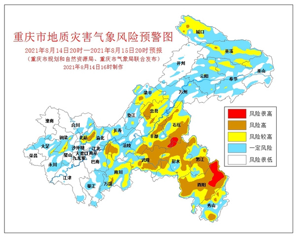 人民網重慶8月14日電 8月14日16時,重慶市規劃和自然資源局、重慶市氣象局聯合發布全市地質災害氣象風險預警。