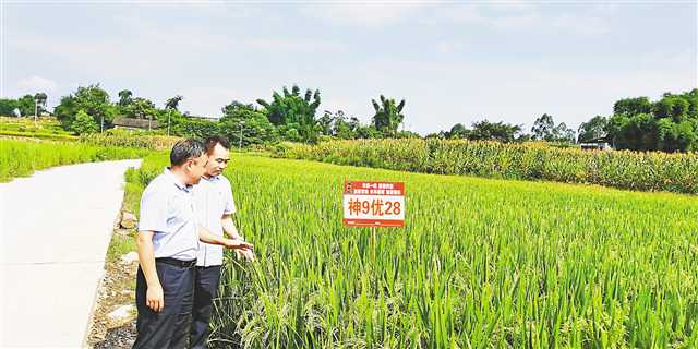 7月27日下午,市農科院水稻所專家李賢勇(左一)在銅梁區石魚鎮查看水稻長勢。(市農科院供圖)