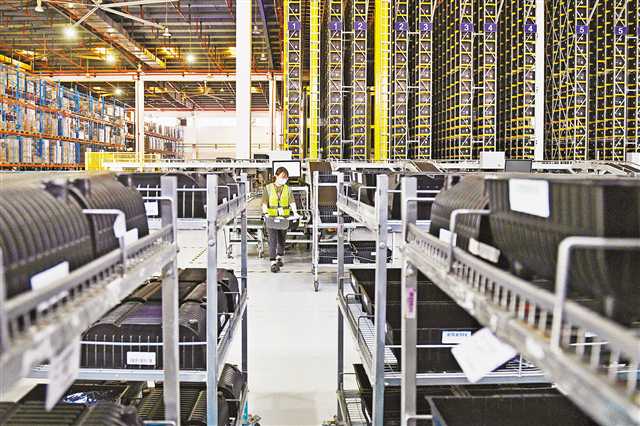 重慶飛力達供應鏈自動化立體倉庫,整個工作場地只有幾個工人在分揀貨物。記者 崔力 攝/視覺重慶