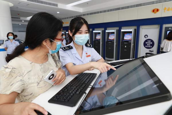沙坪壩區稅務局辦稅服務廳工作人員輔導企業辦稅人員在電子稅務局“非居民扣繳企業所得稅報告套餐”模塊扣繳稅款。古婷婷攝