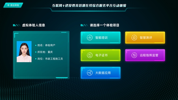 此次展出采用情景模擬的互動式體驗方式,使信息更直觀、更容易理解,用戶可以直觀體驗5大功能。在線學習能直觀體驗在線直播和點播,實時記錄學時完成情況,并結合VR教學,沉侵式體驗施工安全事故模擬現場;智能考試采取現場答題,并結合監考機器人的輔助,讓用戶直觀感受考試現場的嚴肅性;電子證書系統充分利用人臉識別技術,讓用戶體驗證書的授權下載和使用,并通過信息引導用戶對證書的真偽進行核驗;遠程指揮監管讓用戶以管理者的角度實時掌握全市范圍內考試現場的動態情況,并通過遠程對話方式第一時間處理;大數據分析能夠實時提取從業人員持證比例、年齡結構、學歷范圍等情況并進行分析對比,為管理決策提供數據支撐。