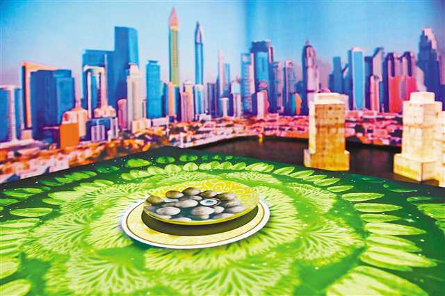 8月23日,在禮嘉智慧公園智慧藝趣館,空盤上出現了美食的投影,周圍的墻面也出現了與之對應的地域風光影像。記者 張錦輝 攝/視覺重慶
