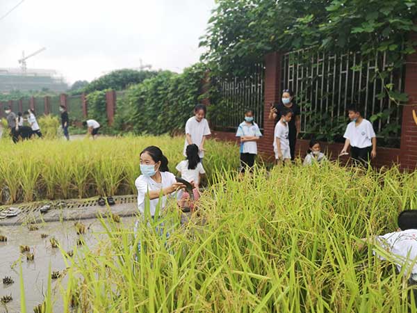 正在割谷子的學生驚喜發現稻田里的魚 江津區教委供圖
