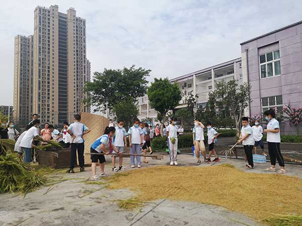 收割完成后,大家忙著打谷子和曬谷子 江津區教委供圖
