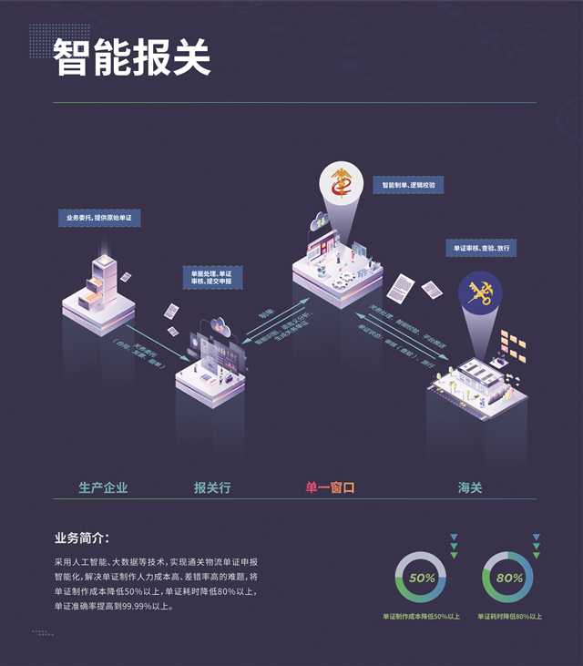 以“智能報關”為例。重慶“單一窗口”在全國首次引入RPA流程自動化機器人,單證處理時間由每票40分鐘縮短到40秒,單證效率提高80%以上,單證成本降低50%以上。