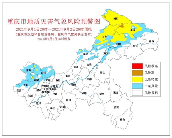 人民網重慶9月1日電 9月1日16時,重慶市規劃和自然資源局、重慶市氣象局聯合發布全市地質災害氣象風險預警。