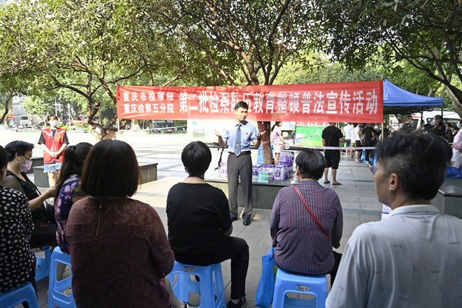 人民網重慶9月3日電 9月2日下午,在渝北區龍山街道龍脊廣場上,排隊接種疫苗的居民正在耐心等待時,被旁邊的一陣宣講聲吸引了注意力,龍山街道龍山路社區黨委聯合重慶市檢察院第五分院“莎姐”法治宣講團正在這里開展政法隊伍教育整頓工作及《民法典》宣講。