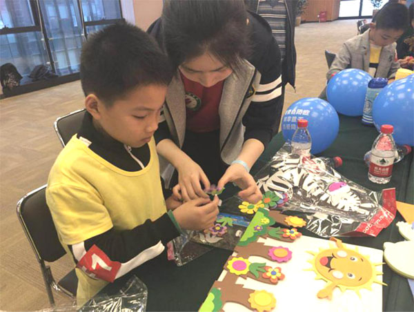 當天,該支行15組客戶家庭組成“小小自愿者家庭”,與重慶市某特教學校的15個自閉癥兒童展開“一對一”互動,一起裝點布置、協作互助,完成了愛心手袋的縫制與創意貼圖的繪制,讓孩子們在互動中交流分享。